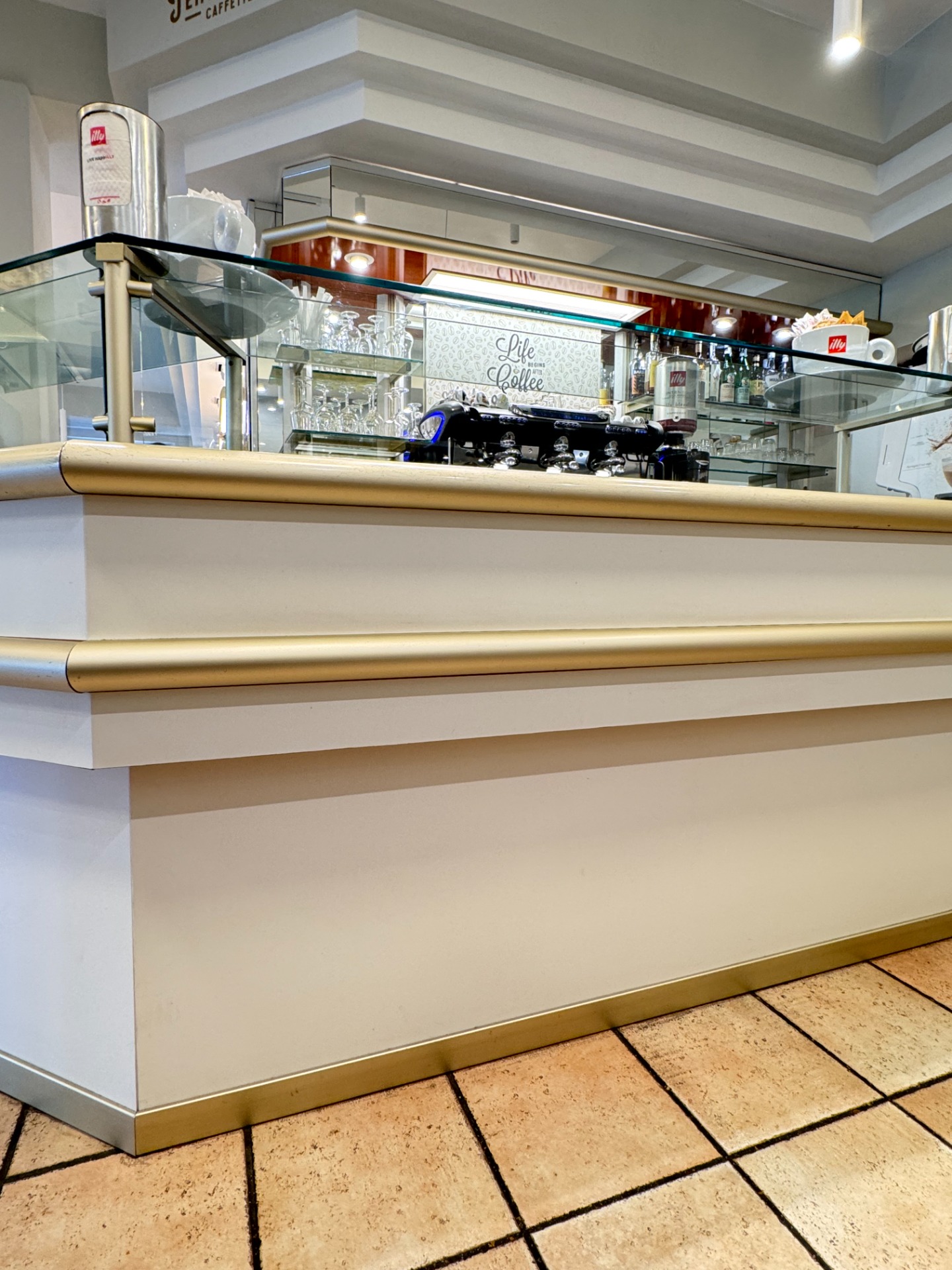 Il bancone mantenuto nella struttura ma riqualificato nell'aspetto. Il piano di appoggio frontale in pietra è stato rimosso e il frontale reso liscio applicando un nuovo pannello rivestito con laminato adesivo beige (interior wrapping).